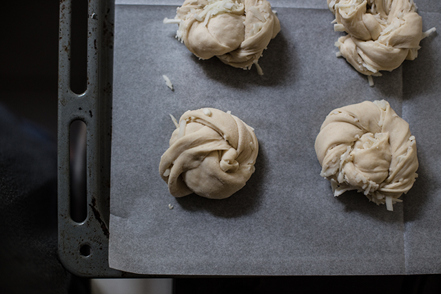 מחלקים את הבצק ל-3 חלקים ומרדדים כל חלק למלבן בעובי של כ-3 מ״מ. מפזרים על הבצק את תערובת הגבינות. בשלב זה אפשר ליצור לחמניות קשר - הסבר מצולם כאן, או לגלגל ולחתוך שושנים.