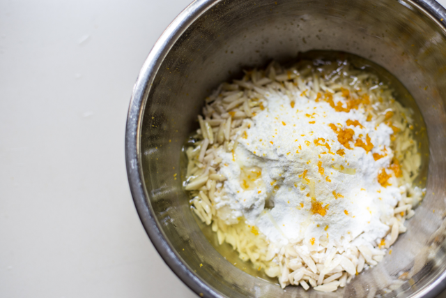 במעבד מזון עם להב מתכת, מעבדים יחד קמח, מלח, אבקת אפיה וחמאה עד שהתערובת הופכת פירורית.
