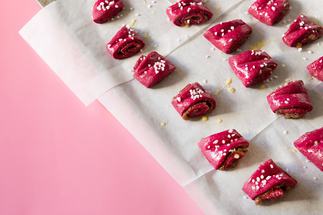 בקערת מיקסר עם וו לישה מערבבים יחד קמחים, שמרים וסוכר. מוסיפים את תערובת החלב והחמאה, הביצה ומחית הסלק ולשים כ-5 דקות. מוסיפים את המלח וממשיכים ללוש עוד כ-7 דקות.